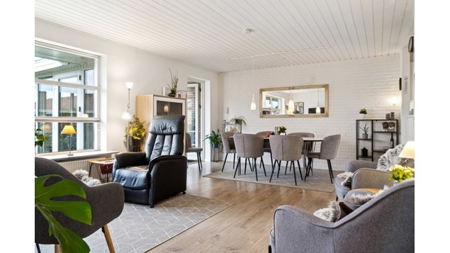 Boligens hjerte udgøres af opholdsmiljøet, som består af et flot køkken og en lys stue. I køkkenet er der rigeligt med skabsopbevaring og masser af albuerum til madlavningen, mens måltiderne nydes i den tilstødende stue, hvor I nemt kan indrette både spisesektion og sofagruppe.