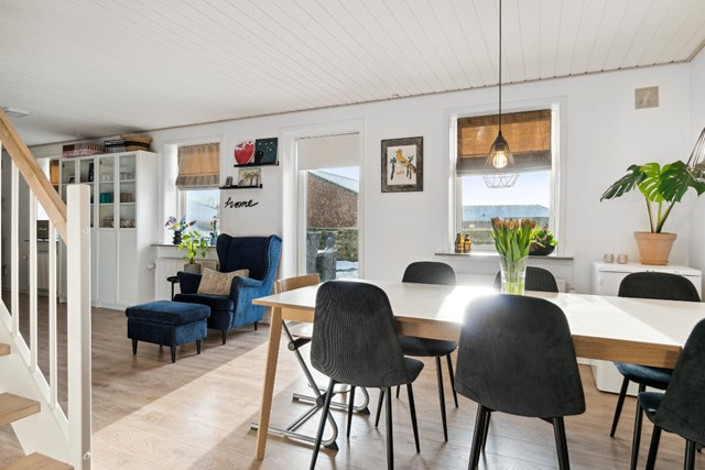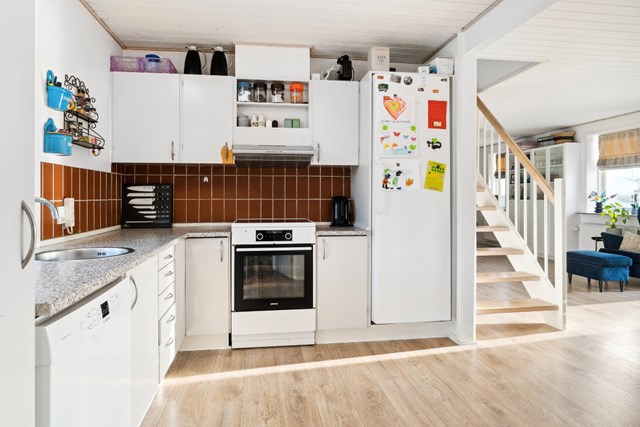 Planløsningen er moderne med et frit flow mellem køkken/alrum og stue. Køkkenet består af hvide skabselementer opsat i en vinkel, hvor I får god opbevaringsplads til alle remedierne. Spisebordet får et oplagt spot i alrummet, og videre kommer I til den hyggelige stue.