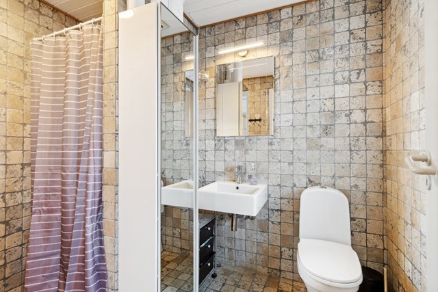 Et pænt badeværelse med muret bruseniche ligger også i stueplanet, ligesom ét af de i alt tre værelser. Førstesalen blev inddraget til bolig i 2013, og børn og forældre har derfor muligheden for at få adskilte soveafsnit.