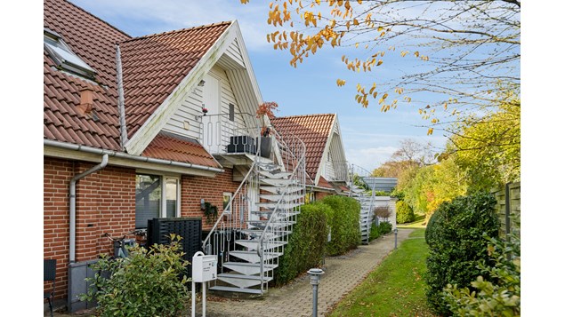 Foran din hoveddør har du en lille repos, hvor du kan have lidt pottede blomster, og ellers er der pæne, velholdte fællesarealer i forbindelse med ejendommen, som blandt andet omfatter en græsplæne og en terrasse.