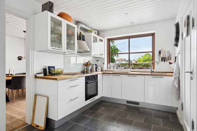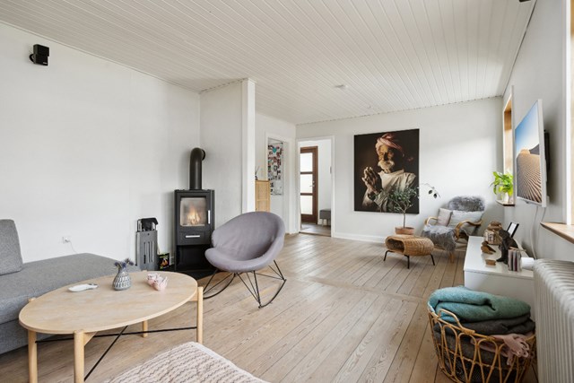 Stilen er flot allerede udefra, hvor der tydeligvis er værnet om den originale stil, men i en moderne udgave. Indenfor bemærker I på samme vis gulvet i stuerne, der står flot og fremhæves af lysindfaldet fra flere vinkler. Begge stuer har forbindelse til køkkenet, der er udført i hvid med en naturpræget bordplade.
