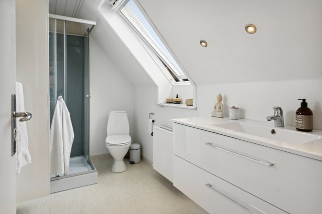 Stueplanet afsluttes af et gæstetoilet, inden I skal gå op på første sal og se de tre værelser samt badeværelset, der er renoveret i 2023 og har bruseniche.