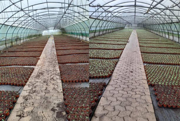 Tre ugers udvikling af de 72.000 stedmoder og hornvioler Korshøj Gartneri har plantet // Foto: Korshøj Gartneri