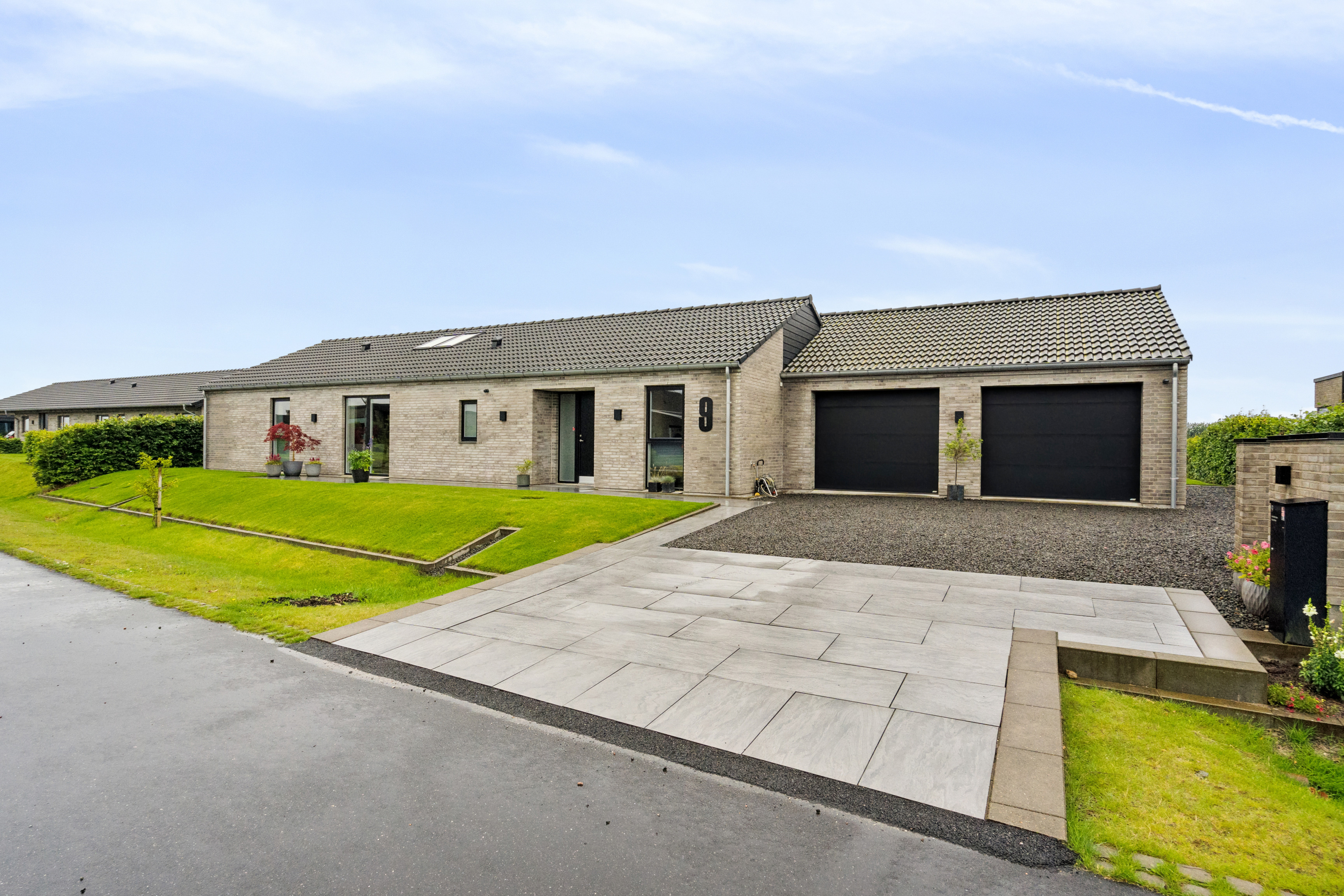 Udenfor venter en skøn have med en delvist overdækket terrasse og et vældigt græsareal. Begge dele har et herligt udsyn til det åbne landskab. Foran hjemmet er der anlagt en bred indkørsel, og bilen kan parkeres i den store, murede dobbeltgarage.