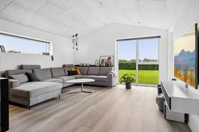 Fra køkken-alrummet kan I åbne de franske døre på vid gab ind til en dejlig stue, hvor I nemt får arrangeret et hyggeligt og komfortabelt opholdsmiljø.