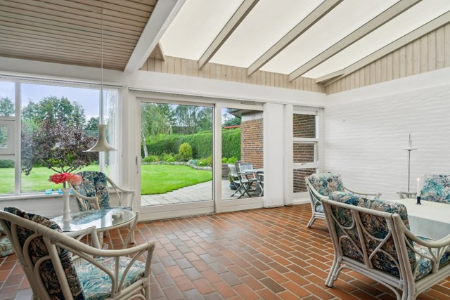 Det bliver en fornøjelse at samles i den præsentable spise- og opholdsstue med videre forbindelse til den store, lukkede terrasse, der opleves som en havestue, og her kan sæsonen virkelig forlænges.