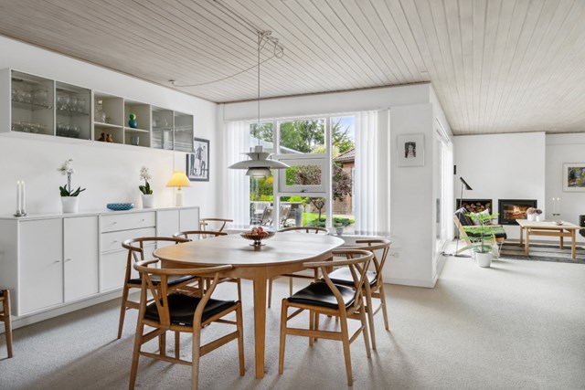 Selve stuen fordeler sig i to sektioner, hvor det ene afsnit har en hyggelig pejseindsats med udgang til terrassen, mens der fra den anden del er franske døre til det moderniserede spisekøkken. Sidstnævnte er stilrent i hvid og med god arbejdshøjde. Fra spiseafsnittet er der forbindelse til bryggerset.