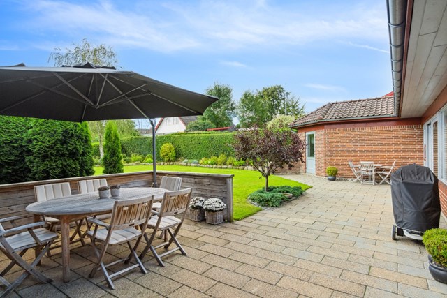 Glæd jer til at træde ud i haven, der er meget flot holdt med enkelte, nemme bede og en stor græsplæne til de legende børn. I kan nyde synet af det hele fra den brede terrasse. I den murede garage er der også et værkstedsrum.
