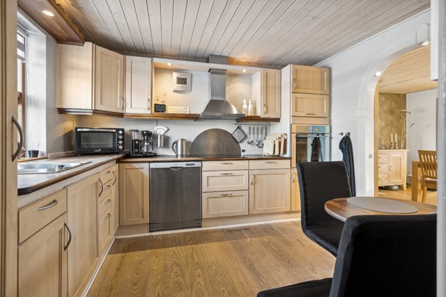 En dejlig vinkelstue udgør det primære opholdsrum, hvor sollyset strømmer ind gennem de store vinduer. Her er der masser af plads til hyggelige indretninger, og med åben forbindelse til køkkenet, der endda har plads til en spiseplads, føles samværet i hverdagen forstærket.