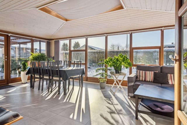 Fra stuen er der adgang til en fantastisk udestue, der er udstyret med varmepumpe. Her får I et lysindfald, der ikke findes andre steder i huset, og udestuen fører ud til en overdækket terrasse. Børnefamilien vil helt sikkert også værdsætte den store have, der er nem at vedligeholde, og hele herligheden er omgivet af hække.